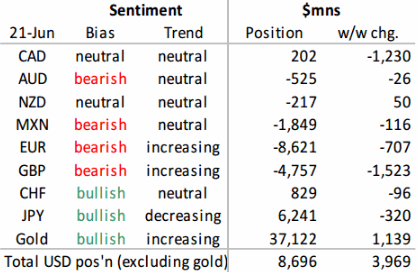 Как следует из последних данных CFTC, за неделю до 21 июня спекулянты в целом наращивали длинные позиции по доллару накануне референдума по «Брекзиту», а основные медвежьи ставки пришлись на луни и фунт. Умеренно вырос объем чистого шорта по евро, который остается крупнейшим среди основных валют, а в иене, которая остается главным фаворитом спекулянтов, наоборот наблюдалось небольшое сокращение чистого лонга. Бычье позиционирование по золоту достигло исторического максимума в $37.1 млрд, а объем чистого лонга по доллару все еще остается довольно небольшим и составляет $8.7 млрд. Третью неделю подряд продолжает сокращаться объем чистого лонга в луни (в основном, благодаря росту объема новых шортов), и теперь он составляет всего $0.2 млрд. Изменение за отчетную неделю (-$1.2 млрд) оказалось максимальным с начала 2014 года. Объем чистого шорта по фунту накануне референдума вырос на $1.5 млрд (до $4.8 млрд), в основном благодаря закрытию длинных позиций. В евро закрывались как длинные, так и короткие позиции. Что касается франка и иены, то здесь по историческим меркам изменения оказались совсем небольшими. Источник: ProFinance.Ru - Новости рынка Forex
