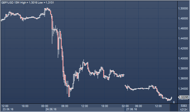 Курс фунта стерлингов к доллару США в понедельник упал до самой низкой отметки с 1985 года, тогда как юань опустился до минимума с 2010 года. К 15:45 мск фунт подешевел на 3.7%, до $13152. По итогам сессии в пятницу фунт потерял более 8%, что стало рекордным падением в истории валюты. Аналитики продолжают анализировать последствия выхода Великобритании из ЕС и дают игрокам советы покупать безопасные активы - золото, госбумаги, доллар и иену. При этом некоторые эксперты полагаеют, что курс фунта может опуститься еще сильнее до конца нынешнее года.