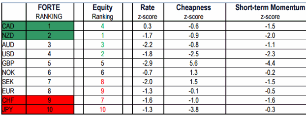Стратеги BofA-ML решили не отставать от своих коллег и конкурентов и запустили еще одну квантовую модель «FORTE». При формировании торговых сигналов по определенной валюте она учитывает динамику фондового рынка соответствующей страны, тренд соответствующей валюты, моментум, а также ее положение относительно «справедливой» цены, то есть недооцененность / переоцененность. До настоящего момента система была в длинных позициях по луни и киви (зеленые (см.таблицу внизу)) против франка и иены (красные) и теперь сформировала новый сигнал на покупку доллар/франка.