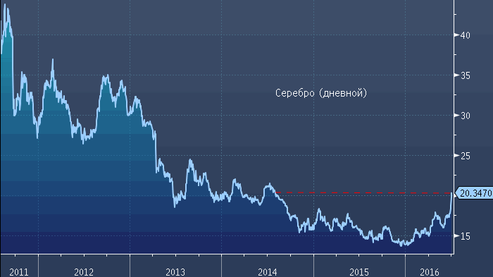 Драгметаллы начали неделю мощным ростом: серебро впервые за два года взлетало выше $21, а золото дорожает четвертую сессию подряд. Оба металла с небольшими перерывами растут с самого начала года, но в последнее время их динамика стала довольно необычной: они дорожают на фоне всплеска спроса на защитные активы (Брекзит), а затем продолжают рост на фоне возвращения инвесторов «в риск» (пост-Брекзит). По данным Bloomberg, объем физического металла, которым обеспечены паи «серебряных» ETF, достиг в июне рекордного размера, что касается аналогичного показателя для «золотых» ETF, то он находится на максимальном уровне с августа 2013 года.