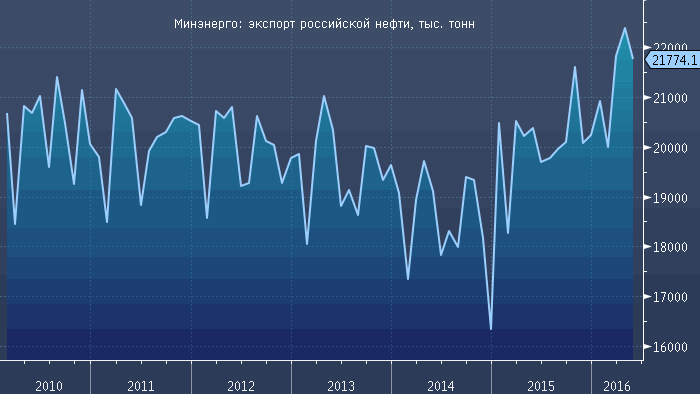 Российские компании старательно увеличивают экспорт нефти на фоне усиления конкуренции в Европе и в этом году могут поставить новый рекорд. По данным Минэнерго экспорт российской нефти в первом полугодии 2016 года вырос на 4.9% до 5.55 млн баррелей в день по сравнению с тем же периодом прошлого года. Добыча по итогам июня выросла на 1.14% до 10.83 млн б/д. На ежемесячной основе показатель растет непрерывно с июля 2014 года. Предыдущий рекорд экспорта российской нефти был поставлен в 2007 году (253 млн. тонн).