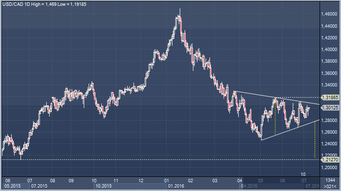 На дневном графике валютной пары доллар/канада с мая месяца цены консолидируются в формации сходящегося треугольника. Технически, это является сигналом продолжения установленного в этом году нисходящего тренда. Можно рассмотреть вход в короткую позицию в диапазоне 1.3120/40 с целью на 1.2400 и стопом на 1.3260. С фундаментальной точки зрения, последствия Brexit окажут ограниченное влияние на цены на нефть, которые в целом будут оставаться стабильны во втором полугодии текущего года. А вот ужесточение финансовых условий сводит на нет возможность повышения ставок ФРС США, что уже учтено рынком, однако это был ключевой драйвер роста американской валюты в прошлом году и сейчас он нивелирован. Потенциально возможный кредитный кризис и кризис европейского банковского сектора способен повысить спрос на доллар США, как актив безопасной зоны, но против европейских валют. В соотношении с канадским долларом это будет иметь ограниченное влияние.