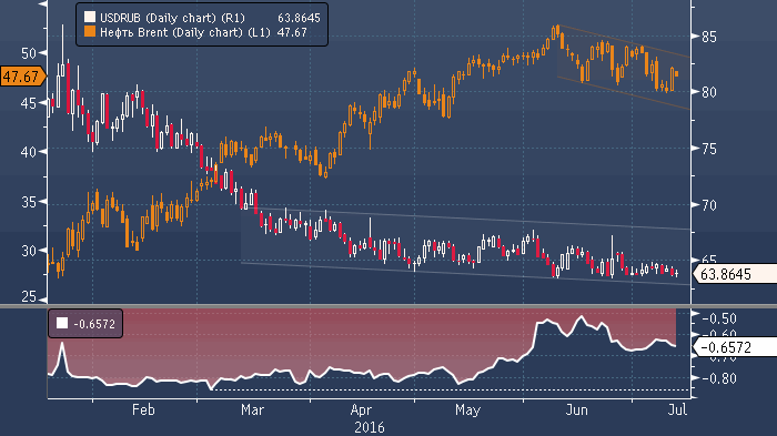 Очевидной тенденцией летнего периода является существенное снижение зависимости динамики курса рубля от цен на нефть. Если в цифрах, то 30-дневная обратная корреляция курса доллар/рубль и цен на нефть марки Brent сократилась до 65.7%, в то время как в начале марта она достигала максимумов на уровне 86.% (прим. Profinance.ru: обратная корреляция 100% говорит, что всегда при росте цен на нефть курс доллар/рубль падает и наоборот. Обратная корреляция 0% сообщает о полном отсутствии зависимости в динамике двух активов).