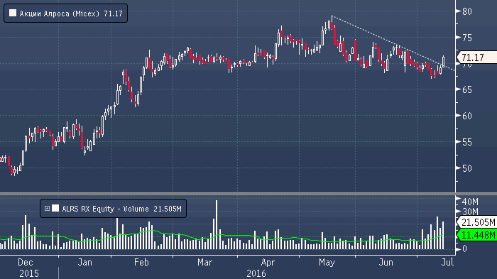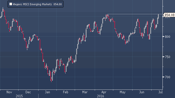 Такая ситуация определяется в настоящий момент тем, что глобальные ветры для России оказались не встречными, а попутными. Ситуация вокруг Brexit оказала поддержку росту спроса иностранных инвесторов на российские активы. Как видно, если судить по динамике индекса MSCI Emerging Markets, развивающиеся рынка крайне неплохо выглядят в этом году. Особенно период после референдума в Великобритании. Однако индекс ММВБ торгуется с дивидендной доходностью, превышающей аналогичный показатель для MSCI Emerging Markets (4.6% против 2.7% соответственно). Акции алмазодобывающей компании Алроса поднялись в цене выше 71 рубля за бумагу по результатам завершения государством приватизации 10.9% своей доли в этой компании.