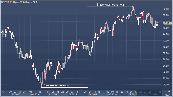 Цены на нефть в январе достигли 12-летних минимумов. Но в период с января по июнь 2016 года стоимость нефти практически удвоилась, позволяя предположить оздоровление ситуации на фоне сокращения объемов производства в США, увеличения мирового спроса, и перебоя в поставках из Канады, Нигерии, Венесуэлы и Ливии. Перечисленные факторы во многом способствовали устранению дисбаланса спроса и предложения. Однако со второй половины июня и по настоящий момент в ценах на нефть мы наблюдаем нисходящую коррекцию. Все большее количество рыночных экспертов склоняется теперь к тому, что ценам придется вернуться к психологическому уровню $40 за баррель (прим. Profinance.ru: мы указали на потенциал возвращения к этому уровню в своих аналитических комментариях, опубликованных еще 11 июня).