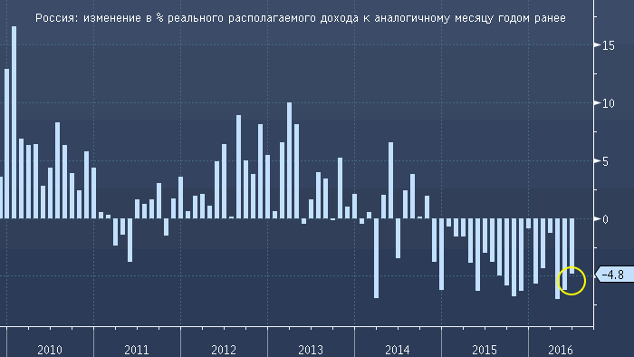 реальный располагаемый доход (реальный доход после уплаты налогов) в июне 2016 года по сравнению с июнем 2015 года (г/г) сократился на 4.8%. Данные оказались немного лучше ожиданий, поскольку экономисты в среднем ожидали снижение на 5.0%. Однако предыдущий майский показатель был существенно пересмотрен в сторону понижения: в мае реальный располагаемый доход упал не на 5.7% г/г, как сообщалось в первом чтении, а на 6.2% г/г.