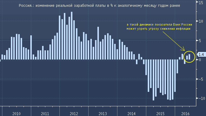 реальная заработная плата, то есть зарплата с поправкой на инфляцию или показатель покупательной способности, в июне 2016 года по сравнению с июнем 2015 года выросла на 1.4%, в то время в среднем прогнозировалось снижение показателя на 1.0%. Более того, реальная заработная плата в мае была существенно пересмотрена в сторону повышения: с -1.0% г/г до +1.0% г/г. Такую динамику заработных плат Банк России, который внимательно следит за этим показателем, может расценить, как угрозу достижения намеченных инфляционных целей (4% к 2017 году). Такие цифры снижают вероятность сокращения ключевой ставки Банка России.