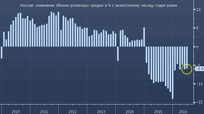 объем розничных продаж в июне 2016 года по сравнению с июнем 2015 года сократился на 5.9%. Показатель оказался хуже прогнозов — ожидалось снижение на 5.4% г/г. Несмотря на то, что заработные платы, как выясняется, показали хороший рост в мае и июне, объем розничных продаж продолжает демонстрировать снижение, указывая на слабость внутреннего спроса. Напомним, что в мае розничные продажи упали на 6.1% г/г. Показатель не был пересмотрен.