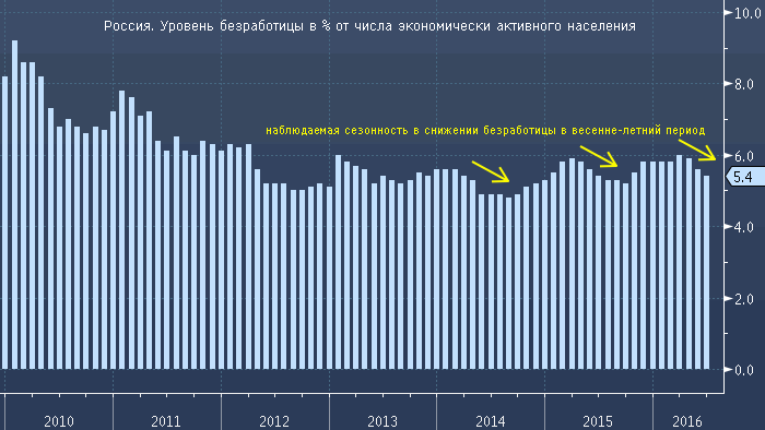 безработица 3-й месяц подряд активно демонстрирует снижение. Снизившись на 0.3% до 5.6% в мае, в июне 2016 года безработица упала до 5.4% от экономически активного населения страны, что на 0.1% оказалось лучше прогнозов. Соответственно, на момент начала 2-ого полугодия 2016 года официально безработными считаются 4.2 млн. человек. Из них в службах занятости зарегистрирован 1 млн. человек. 800 тыс. человек получают пособие по безработице. Источник: ProFinance.Ru - Новости рынка Forex