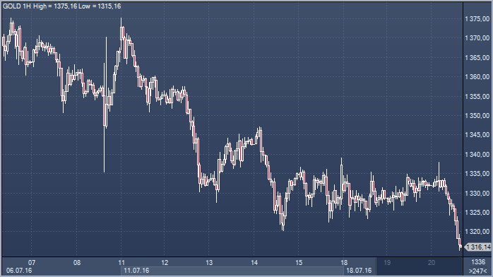 Сегодня цены на золото снижаются под влиянием укрепляющегося доллара США. В евро золото немного подорожало до €1210 за унцию. Росту курса доллара способствуют позитивные данные по рынку недвижимости США: как число закладок новых домов, так и количество выданных разрешений на строительство в июне оказалось больше прогнозов. В результате усилились ожидания в отношении повышения ставки ФРС. Согласно фьючерсам на ставку по федеральным фондам, вероятность повышения ставки еще до конца текущего года сейчас составляет 43%, а вероятность повышения до конца 2017 года – 70%.