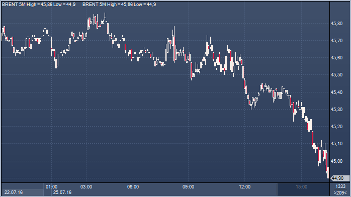Снижение цен на нефть ускорилось в ходе торгов в понедельник. Котировки обновили минимальные отметки за два месяца из-за опасений по поводу избытка запасов на рынке и низкого спроса на сырье со стороны НПЗ. Число работающих нефтяных буровых выросло в США на предыдущей неделе на 14, до 371, причем рост этого показателя продолжился 4-ю неделю подряд, согласно данным Baker Hughes Inc., опубликованным в прошлую пятницу. Рост позиций на продажу нефти сорта WTI за неделю, завершившуюся 19 июля, был максимальным в этом году, свидетельствуют данные Комиссии по срочной фьючерсной торговле сырьевыми товарами (CFTC) США.