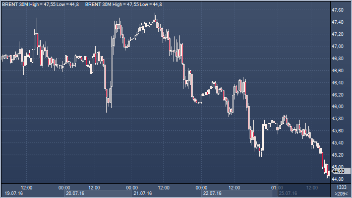 "Нефть продолжает дешеветь вследствие увеличения числа буровых установок в США и укрепления доллара. Сентябрьские фьючерсы Brent в пятницу упали в цене на $0,51/барр., до $45,69/барр. За неделю снижение составило 4%. Сегодня утром давление на котировки сохраняется. На прошлой неделе число действующих буровых установок на нефть в США, по данным Baker Hughes, выросло на 14, до 371 шт. Это наибольший прирост с декабря, а нынешний период роста - самый продолжительный с августа прошлого года (семь из последних восьми недель завершились ростом числа буровых). Добыча нефти в США растет вторую неделю подряд (по данным за 9-15 июля). Сезон пикового спроса на бензин в стране, связанный с летними отпусками, подходит к концу, и поэтому дальнейшее сокращение запасов в хранилищах под вопросом, особенно в связи с сезонными профилактическими работами на НПЗ в августе-сентябре. Также давление на котировки Brent оказало укрепление доллара.