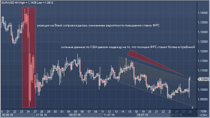 Для понимания придется вернуться в недавнее прошлое. Еще до референдума в Великобритании экономическая статистика по США дала рынку, как факт, крайне слабый первый квартал. Он привел к существенному снижению ожиданий повышения ставок ФРС в течение 2016 года. Затем Великобритания проголосовала за выход из Евросоюза. В качестве реакции на это решение доллар укрепился к евро, как актив безопасной зоны. Но при этом ожидания повышения ставок в 2016 году были практически сведены на нет.