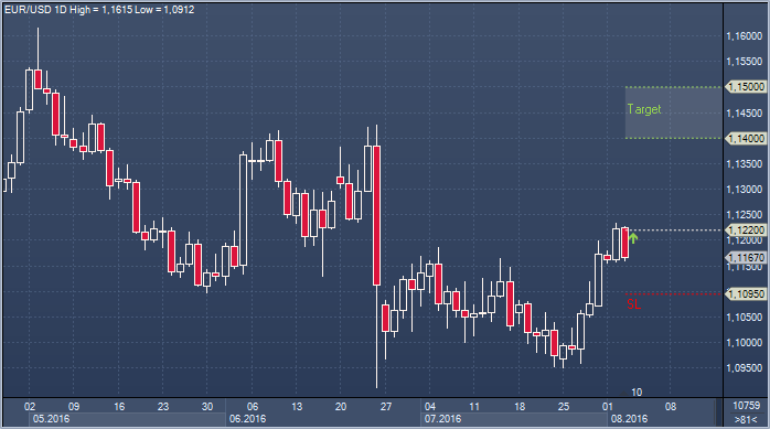 Евро/доллар сегодня сдает позиции в данный момент держится у минимумов сессии, но валютные стратеги Westpac полагают, что дело ограничится лишь коррекцией. В банке указывают на то, что техническая картина с прорывом выше 1.1150/1.1200 улучшилась, а на недельном графике было сформировано бычье поглощение. Фокус остается смещен к сопротивлению с максимумов мая вблизи 1.1290, при этом в Westpac полагают, что баланс рисков благоприятен для быков еще и с точки зрения изменения в настроениях участников рынке. В банке отмечают, что отчет по ВВП США охладил интерес инвесторов к доллару, и, в то время как в Еврозоне картину радужной не назовешь, в центре внимания все же находится американская экономика с удручающим средним темпом роста в 1% в последние три квартала. В Westpac предупреждают, что более слабая статистика из США в ближайшем будущем может подкрепить опасения относительно способности FOMC повысить ставки до конца года, и в банке ждут возвращения курса к 1.14/1.15. В соответствие с озвученной выше точкой зрения, Westpac принял решение об открытии длинной позиции в евро/долларе от 1.1220 с целью в районе 1.14/1.15 и стопом на 1.1095.