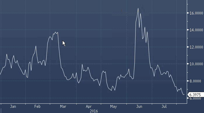 Барометр ожидаемых колебаний в евро упал до самого низкого уровня почти за два года, поскольку инвесторы делают ставку на то, что наиболее торгуемые валюты в мире будут оставаться диапазоне перед выступлением председателя Федеральной резервной системы Джанет Йеллен 26 августа на ежегодном симпозиуме в Джексон-Хоуле (штат Вайоминг). Двухнедельная подразумеваемая волатильность евро/доллара упала до 6.31 процентного пункта вчера, что стало минимумом с октября 2014 г. Инвесторы используют подразумеваемой волатильность для определения цены опционов.