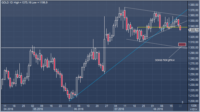 Краткосрочная техническая картина в ценах на золото становится отчетливо медвежьей. В соответствии с нашими предыдущими комментариями, мы ожидаем на дневном графике цен на золото формирование флага (см. график) с нижней границей в области 1300 долларов за тройскую унцию. Это ключевой уровень поддержки, область которого также включает максимумы мая и июня (рассматриваются цены закрытия дня). Попытки возвращения к 1340 долларов за унцию следует использовать для продаж с указанной выше целью. Стопы следует разместить на 1358 долларов за унцию. Однако в случае возвращения цен к 1300, область вокруг этого уровня становится привлекательной для возобновления длинных позиций. Источник: ProFinance.Ru - Новости рынка Forex