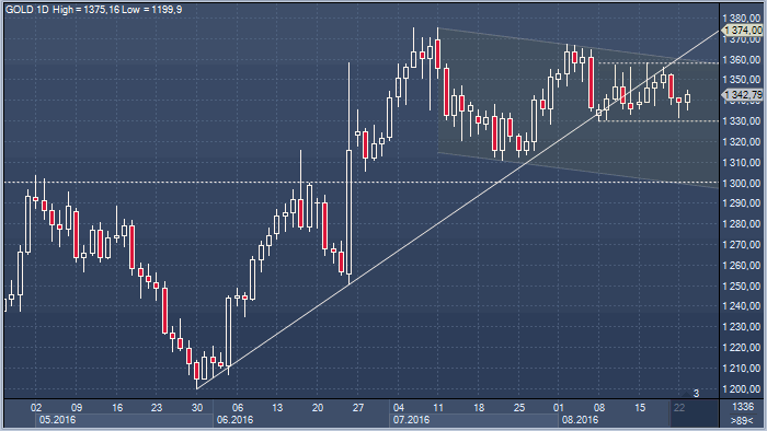Низкие процентные ставки в США является драйвером роста для золота. Обладание данным драгоценным металлом не приносит прибыли в виде дивидендов, как акции, или же в виде купонных выплат, как облигации. Очевидно, что сейчас цены на золото застряли в диапазоне 1330 — 1358 долларов за унцию и не покинут его, пока не услышат выступление главы ФРС в Джексон Хоуле 26 августа. Речь госпожи Йеллен должна прояснить, стоит ли ожидать повышения ставок до конца года или же нет. А может быть стоит ожидать два повышения ставок? Сейчас на этот счет идут спекуляции. Они будут продолжаться и после выступления в Джексон Хоул, но это событие даст новую пищу для размышлений. А пока указанный диапазон цены не покинут.