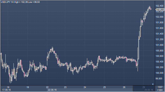 Доллар развивает на торгах в понедельник положительную реакцию на оптимистичные комментарии главы Федеральной резервной системы США Джанет Йеллен о состоянии американской экономики, которые усилили ожидания повышения ключевой ставки. В ходе ежегодной конференции представителей мировых центральных банков в Джексон-Хоуле, штат Вайоминг, Йеллен отметила, что возможность повышения ставки выросла в последние месяцы на фоне укрепления рынка труда и экономики. Глава ФРС заявила, что решение регулятора будет зависеть от статистических данных. Тон выступления Дж.Йеллен "был ястребиным, чего мы и ждали", отмечают эксперты BNP Paribas.