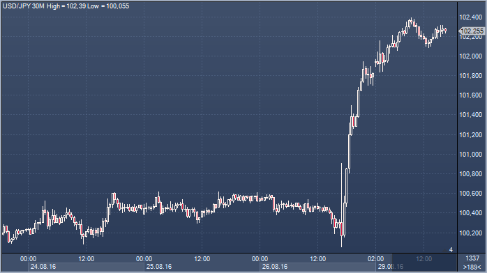 Доллар обновил максимум трёх недель к иене в понедельник, поскольку комментарии Стэнли Фишера из Федрезерва США укрепили ожидания повышения процентной ставки в ближайшей перспективе. Доходность гособлигаций США выросла до максимума с июня. Судя по котировкам фьючерсов на уровень ставки, участники рынка оценивают шансы на повышение ставки в сентябре в 42%, хотя еще на прошлой неделе оценка не превышала 22%. Выступая на трёхдневном симпозиуме глав центробанков в штате Вайоминг, Йеллен сказала, что вероятность повышения ставки ФРС выросла в последние месяцы благодаря улучшению показателей рынка труда и ожиданиям умеренного экономического роста. Йеллен по обыкновению не уточнила, когда американский ЦБ может вновь повысить ставку, на это отважился её заместитель Стэнли Фишер, заявив что в этом году ставка может быть повышена еще дважды — в сентябре и декабре.