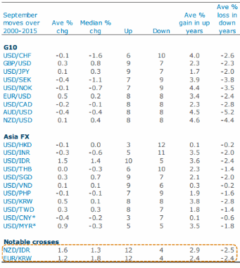 Как следует из наших данных, с точки зрения сезонности, сентябрь является малоинтересным месяцем, в котором исторически движения валют обычно незначительны, а угадать их проще всего с помощью монетки. Единственной отчетливой тенденцией этого месяца за последние шестнадцать лет является укрепление евро против азиатских валют. Двумя наиболее интересными парами для сезонной покупки являются евро/корейский вон и киви/индийская рупия, которые росли в 12 из последних 16 сентябрей. Источник: ProFinance.Ru - Новости рынка Forex