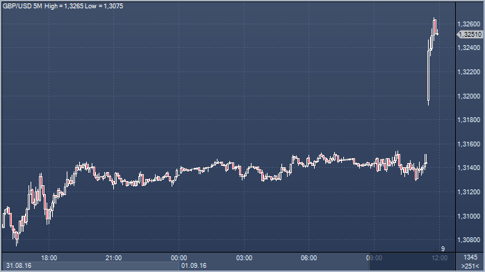 Фунт выстрелил вверх в реакции на неожиданно сильные экономические данные. Деловое доверие в Великобритании совсем не пострадало после референдума о выходе из ЕС, напротив — индекс PMI достиг 10-месячного максимума в августе, поскольку более слабый фунт помог сектору промышленного производства показать отскок после Brexit. Это уже второй отчет, второй сектор, после розничных продаж, который не пострадал, а наоборот выиграл за счет развода с ЕС. Оказались правы те экономисты, которые предполагали сильный импульс для экономики от девальвации фунта. Проблема в том, что девальвационный рост имеет свойство продолжаться очень короткий срок — до полугода, далее в силу вступают более мощные факторы, такие как инвестиции и внутренний спрос.