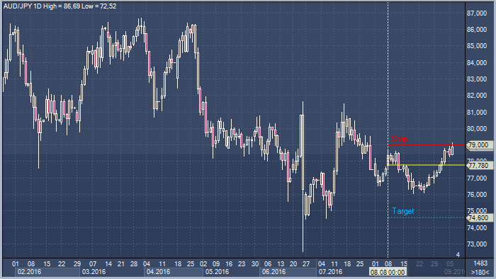 Аусси/иена. Продажа от 8 августа по 77.78 закрыта на 79.00 (Stop-loss). Убыток 122 пункта