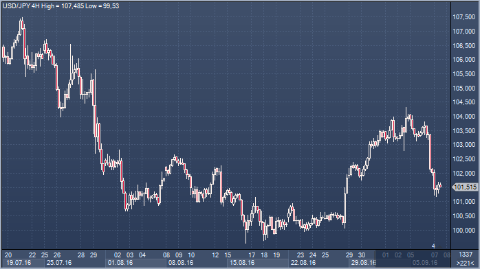Короткая позиция по USD/JPY сейчас может быть рискованной. Неопределенность вокруг того, что Банк Японии будет предпринимать на встрече в сентябре; задержка ФРС в повышении ставок могут благоприятствовать склонности к риску, что может поддержать пару через кросс-курсы иены. Необходимо внимательно наблюдать за комментариями официальных лиц ФРС на этой неделе. USD/JPY может естественным образом отскочить к 102.00; вряд ли пара доберется до 102.50 без нового импульса. USD/JPY снизился сегодня на 0.5% 101.53, оставаясь в диапазоне 101.21-102.13. Источник: ProFinance.Ru - Новости рынка Forex