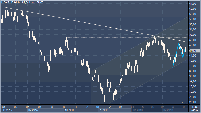 Итак, в чем, на самом деле, заинтересован ОПЕК и Россия? Их миссия заключается в том, чтобы реализовать суть поговорки «и волки сыты, и овцы целы». В более широком формате следует добиться уверенной стабилизации цен в диапазоне 40 — 60 долларов за баррель. Предпочтительнее было бы получить стабильность в еще более узкой области 50 — 60 долларов за баррель. ОПЕК не заинтересован в росте цен выше 60 долларов. Более того, Картель ни в коем случае не желает собственноручно выступать драйвером бычьего движения выше 60 долларов за баррель, поскольку не желает возвращения бума сланцевой отрасли США, что загубит все результаты нескольких лет кровопролитной войны за долю рынка.