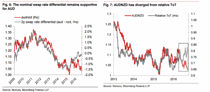 Курс аусси/киви (AUDNZD) демонстрирует (см. ниже) существенное расхождение с динамикой номинального дифференциала свопов (в течение всего 2016 года). Это должно стимулировать восходящее движение валютной пары. Изменение торговых условий (terms-of-trade или ТоТ - как отношение экспортных цен к импортным ценам) является важным фактором для обеих валют. С июня курс аусси/киви сильно отклонился от динамики ToT. Нам кажется, что недавнему относительному восстановлению сырьевых цен еще только предстоит оказать поддержку австралийскому доллару.
