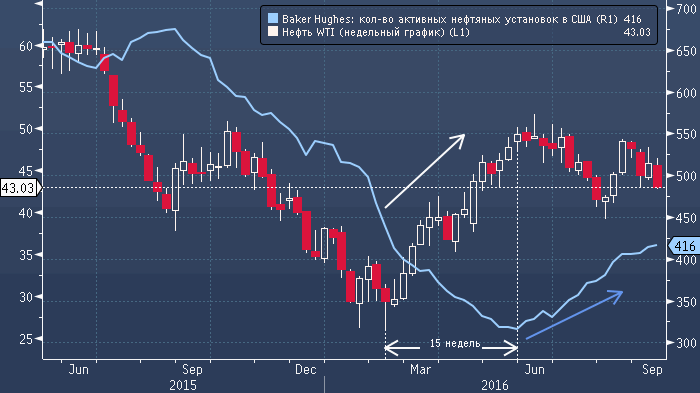 количество активных нефтяных установок в США за неделю до 16 сентября выросло на 2 до 416 штук