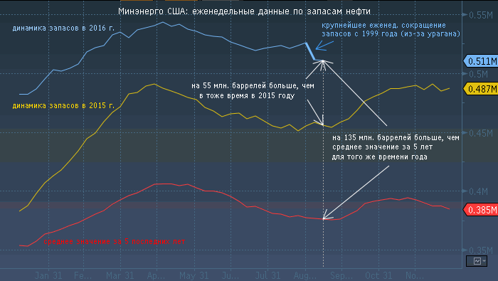 Коммерческие запасы нефти в США (не считая стратегического резерва) за неделю, закончившуюся 9 сентября, неожиданно упали на 0.6 миллиона баррелей, или на 0.1% - до 510.8 миллиона баррелей. Аналитики, напротив, полагали, что запасы за неделю выросли на 3.8 миллиона баррелей, до 515,2 миллиона баррелей. Запасы нефти на крупнейшем в стране терминале в Кушинге (Cushing) упали на 1.2 миллиона баррелей — до 62.2 миллиона баррелей. Запасы бензина в США увеличились на 0.6 миллиона баррелей, или на 0.2% - до 228.4 миллиона баррелей. Эксперты ждали, что показатель вырастет на 0.343 миллиона баррелей. Запасы дистиллятов выросли на 4.6 миллиона баррелей, или на 2.9%, — до 162,8 миллиона баррелей. Аналитики прогнозировали, что этот показатель вырастет на 1.543 миллиона баррелей.