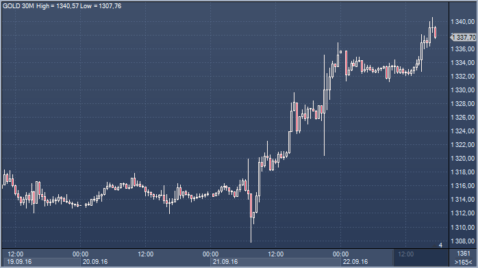 Цены на золото достигли двухнедельного максимума в $1339 за унцию. Поддержку рынку оказали ослабление доллара США, падение доходности американских облигаций и приток вкладов в ETF-фонды по золоту (+5.4 тонны). Как и ожидалось, ФРС США оставила процентные ставки без изменений, хотя это решение не было единогласным: не менее трех членов FOMC проголосовало за повышение ставки на 25 б.п. Кроме того, в свое заявление по итогам заседания ФРС включила фразу о том, что аргументы в пользу повышения ставки стали сильнее. Мы думаем, что все вышесказанное указывает на повышение ставок в обозримом будущем. Мы по-прежнему думаем, что вероятнее всего решение о повышении ставок будет принято на декабрьском заседании, принимая во внимание, что ноябрьское заседание по времени слишком приближено к президентским выборам в США. Впрочем, согласно фьючерсам на федеральные фонды, вероятность повышения ставки в декабре составляет всего 60%. Иными словами, на рынке все еще присутствует скептицизм относительно того, сопроводит ли ФРС свои слова действиями. В свою очередь, это должно оказать поддержку ценам на золото. Источник: ProFinance.Ru - Новости рынка Forex