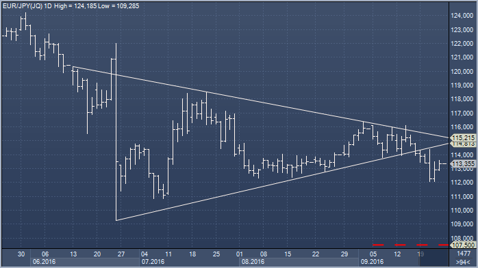 Наши валютные стратеги обращают внимание на медвежью техническую картину в евро/иене. На недельном графике пара пробила основание симметричного треугольника и облака Ишимоку, однако RSI демонстрирует перепроданность, что чревато попытками восходящей коррекции. Несмотря на это, с технической точки зрения, изо все иеновых кроссов именно евро/иена наиболее перспективна. Пара начала снижаться еще до решения Банка Японии, а после него продолжила медвежий тренд, протестировав минимумы августа. Техническая цель выхода вниз из симметричного треугольника — Y107.50. Ближайшие уровни поддержки — Y112.30 и Y110.90, сопротивления — Y114.35 и Y115.80. Источник: ProFinance.Ru - Новости рынка Forex