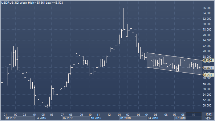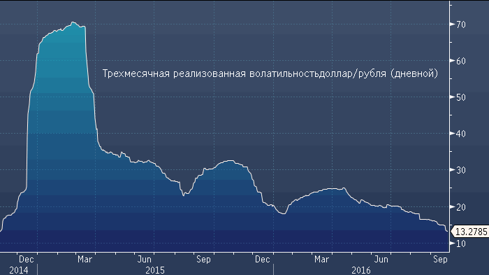 Трехмесячная реализованная волатильность рубля, который занимает второе место после бразильского реала в списке наиболее высокодоходных валют развивающихся стран, в понедельник опустилась до минимальных за последние два года уровней ниже 14%. С начала года Банк России снизил ключевую ставку всего на 1.0% (год назад эксперты Goldman Sachs прогнозировали, что эти цифры составят все 5.0%), и следующего снижения, вероятно, не стоит ждать до 2017 года. «Стабильность курса рубля должна привлечь еще больше «carry-трейдеров», особенно после заявления ЦБР о намерении в обозримой перспективе сохранять статус-кво», - говорит Петр Матыс, лондонский стратег Rabobank. - «В ближайшие недели доллар/рубль останется в диапазоне 63-68».