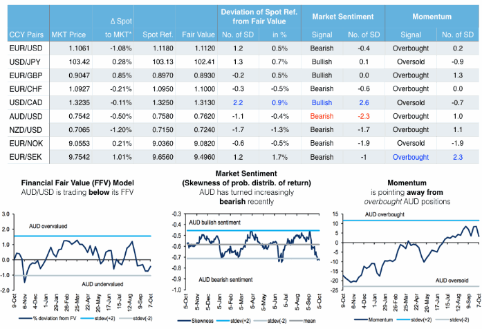 Стратеги Barclays обновили оценку ситуации на валютном рынке своей квантовой модели FX Quant Analyzer, оценивающей текущий курс валютных пар с точки зрения «справедливой стоимости», рыночного настроя и моментума. Итак, исходя из этих критериев, ситуация сегодня выглядит следующим образом: