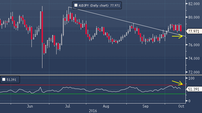 Фьючерс на японский индекс Nikkei 225 теряет в цене более 1.5%. Темпы укрепления иены к доллару на фоне снижения аппетита к риску превышают темпы падения австралийского доллара против валюты США. Это стимулирует медвежью дивергенцию в ценах кросс-курса аусси/иена. Как видно (см. график), 14-дневный RSI уверенно сформировал нисходящую направленность, в то время как цены последние 4 дня остаются в горизонтальном коридоре выше уровня 78.00. Здесь мы наблюдаем риск потенциально возможного резкого нисходящего движения. Если рассматриваете возможность покупки иены, то почему это не сделать против австралийского доллара. Источник: ProFinance.Ru - Новости рынка Forex