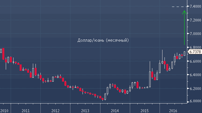 В ближайшие два года доллар/юань вырастет на 17% из-за оттока капитала из Китая, спровоцированного действиями правительства страны по охлаждению рынка жилья, мягкой монетарной политики Банка Китая и роста стоимости заимствований в долларах. По нашим прогнозам, курс пары на конец 2017 и 2018 годов составит 7.4 и 8.1 соответственно. Темпы роста ВВП Китая в четвертом квартале могут замедлиться до 6.2% г/г, а отток капитала в это время усилится.