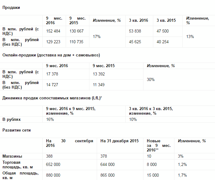 * Информация о результатах продаж сопоставимых магазинов (LfL) основана на сравнении магазинов, открытых не позднее 1 января 2015 года и впоследствии не закрывавшихся на две недели или более либо не изменивших свою общую площадь более чем на 20%.