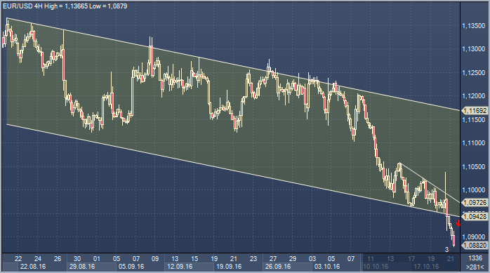 Евро сделал еще один шаг на пути к заветной цели — паритету, пробив сегодня уровень $1.09. Валюта очень долго находилась в диапазоне, и потеря все новых уровней поддержки убеждает спекулянтов в том, что может начаться новый грандиозный тренд. Далее нам предстоит протестировать такие важные уровни как $1.08, а ключевым станет отметка $1.05. При ее пробое начнется обвал. ЕЦБ, как и ожидалось, опроверг слухи о сворачивании программы скупки активов, что и явилось вчера отправной точкой возобновления продаж евро. В начале октября анонимные источники сообщали, что ЕЦБ может начать преждевременное сокращение программы количественного смягчения, уменьшая объем выкупа активов на 10 млрд в месяц. ЕЦБ сохранил процентные ставки без изменений в четверг, как и параметры программы покупки активов на 1.74 триллиона евро ($1.95 триллиона), при помощи которой он пытается оживить экономический рост и инфляцию.