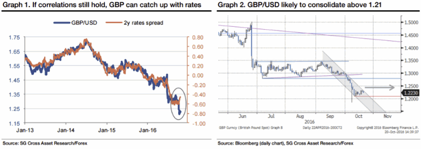 Валютные стратеги Societe Generale (SG) считают, что в свете обвала курса британской валюты можно предположить, что в нем уже учтены неблагоприятные перспективы британской экономики. Это является сдерживающим фактором для медведей, но и повода для существенного роста у фунта нет. В банке полагают, что наиболее вероятным сценарием на ближайшую перспективу видится дальнейшая консолидация фунт/доллара выше 1.21, при этом ее тон вполне может оказаться бычьим. В SG считают, что фунт может немного восстановиться на фоне устранения избыточного объема коротких позиций, тогда как дополнительную надежду на улучшение динамики дает расхождение в динамике фунт/доллара и спреда двухлетних ставок доходности (см. график ниже).