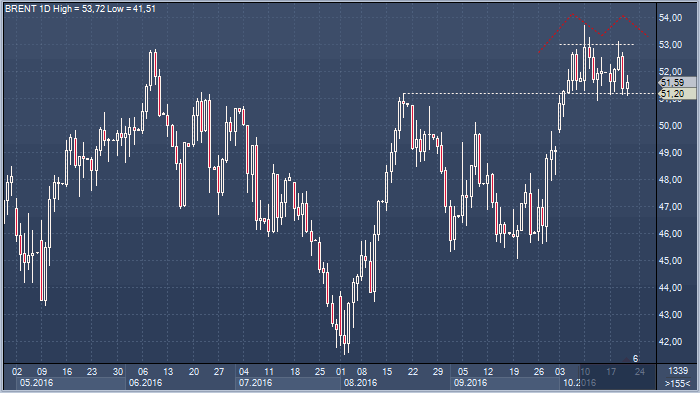Дневной график цен на нефть Brent. С 5 октября горизонтальная консолидация выше предыдущего максимума от 19 августа на 51.20 доллара за баррель, но ниже 53 долларов за баррель (по ценам закрытия дня). С одной стороны, эта консолидация может вылиться в фигуру продолжения тенденции, отражая период тайм-аута, во время которого быки набираются сил перед новым броском. С другой стороны, не менее очевидны намеки на формирование «двойной вершины» - разворотной фигуры, указывающей на истощение сил покупателей. Нет ответа…