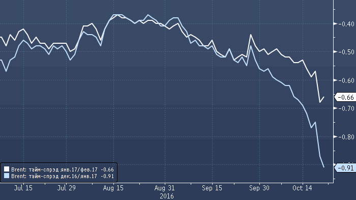 Предположим я до сих пор в лонге в декабрьском фьючерсе. Контракт истекает 31 октября. Судя по объемам, крупные фонды ушли в январский фьючерс еще 12 октября. А те, кто до сих пор в лонге... Какой у них выбор? Делать сейчас ролловер? Тайм-спрэд вырос до 91 цента. Тайм-спрэд между январским и февральским контрактом также вырос до 66 центов. Как-то все это не создает впечатления того, что рынок уверен в потенциале бычьего тренда. А цены растут… Вопрос стало больше чем ответов...