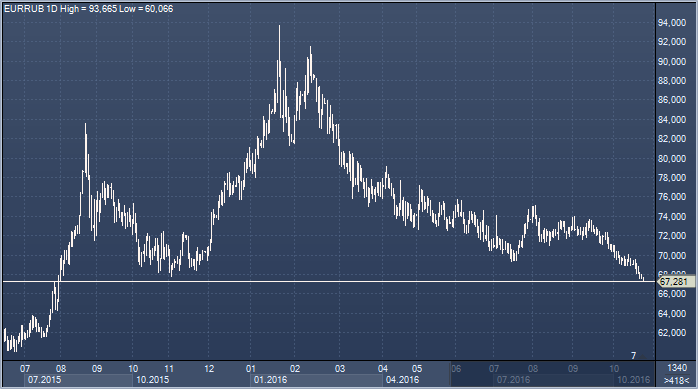 Рубль подошел к важной черте. Утром во вторник его курс растет на фоне эластичности цен на нефть, которые в последние месяцы выбираются из любого падения. Так произошло и вчера — после резкого снижения нефть полностью восстановилась к вечеру, а сегодня котировки пытаются продолжить рост. Рубль сохраняет корреляцию с ключевым товаром российского экспорта и торгуется сейчас на уровне 62.02. 61.8175 — это минимум, установленный 10 октября. Сейчас он служит временный технической поддержкой и ориентиром для спекулянтов. В случае его тестирования и прорыва логично ожидать дальнейшего падения курса доллара к российской валюте. При этом евро продолжает обновлять минимумы. Сейчас он уже подал сильный медвежий сигнал, пробив минимум 4 ноября 2015 на 67.73 и обновил минимальные значения с 31 июля 2015. Евро снижается под влиянием нисходящего движения в евро/долларе, который начал свой неблизкий путь к паритету. Паритет — возможная цель на февраль 2017 года. Указанный прорыв может спровоцировать дальнейшее падение и доллара к рублю. Участники рынка повторяют, что рублю помогает пик налогового периода в РФ, приходящийся на третью декаду месяца.