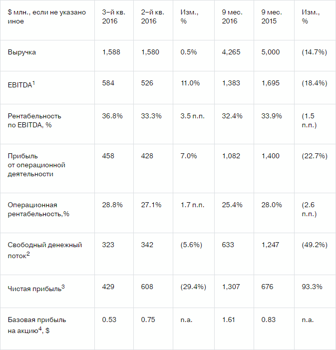 4 Базовая прибыль на акцию от продолжающейся деятельности рассчитана следующим образом: чистая прибыль от продолжающейся деятельности, разделенная на средневзвешенное количество акций в течение периода (810.6 млн. акций за третий квартал 2016 года, второй квартал 2016 года, 9 мес. 2016 года и 9 мес. 2015 года).