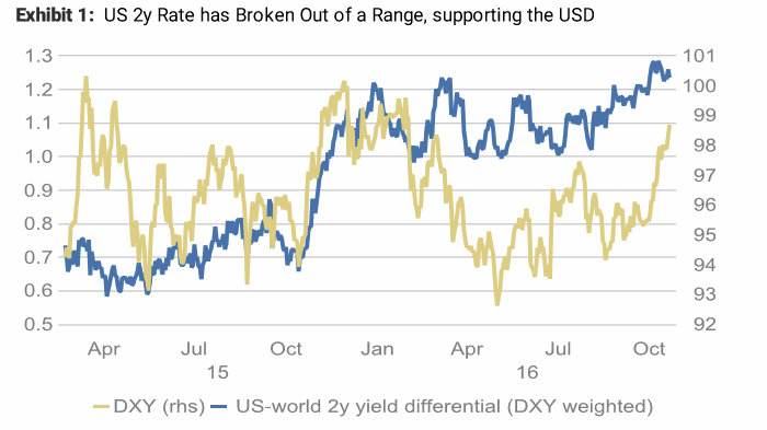 Доллар начал свое недавнее укрепление при поддержке роста доходности 2-летних облигаций Казначейства США по отношению к сопоставимым бумагам других стран с развитой экономикой. Ниже представлен график, демонстрирующий это: на индекс доллара наложен дифференциал (взвешенный по индексу доллара) между доходностью 2-летних трежерис и остальным развитым миром. Изначально ситуация отражала изменение рыночного ценообразования с учетом увеличения вероятности повышения ставок ФРС до конца 2016 года (в настоящий момент эта вероятность составляет приблизительно 67%). Но на прошлой неделе Европейский центральный банк (ЕЦБ) выступил с довольно «миролюбивыми комментариями» и ситуация сдвинулась в пользу дивергенции монетарных политик.