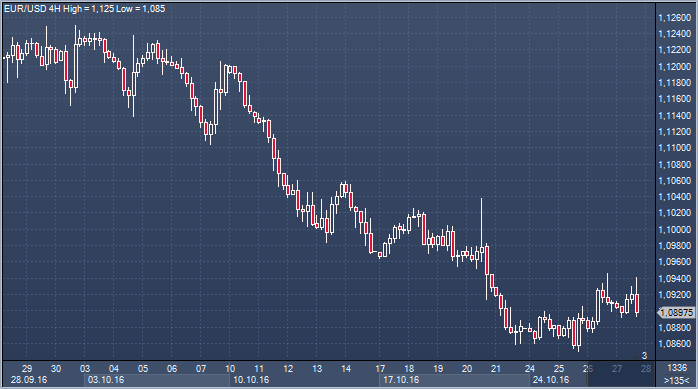 | 27.10.16 18:02 | Scotiabank допускает рост евро к $1.1100 | 27.10.16 19:29 | Курс евро активнее укрепляется к другим конкурентам G10, а против доллара «буксует» |
