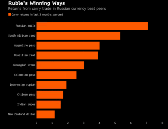 "Что инвесторы будут покупать в нынешних условиях после продажи рублевых активов?", - отвечает риторическим вопросом Лютц Ремеер из Landesbank Berlin Investment, который управляет активами на $12 млрд из немецкой столицы. "Это неразумно - продавать, поскольку рублевые облигации по-прежнему приносят очень высокий доход", - сказал он, добавив, что инвесторы должны принять "менталитет покупки на провалах курса". Заимствование в долларах почти ничего не стоит, поскольку ставки близки к нулю процентов. На взятые в долларах, евро, иенах, франках, фунтах кредиты люди покупают активы, номинированные в валюте Российской Федерации, что принесло инвесторам более чем 7 процентов в течение последних трех месяцев. Это больше всего среди 31 основных валют. Трейдеры удвоят эту прибыль, получив к концу следующего года 15 процентов: это второй результат после инвестиции в аргентинское песо, согласно прогнозам, собранным Bloomberg. Citigroup Inc., крупнейший валютный трейдер, говорит, что Россия создала "супер-керри-трейд" валюту.