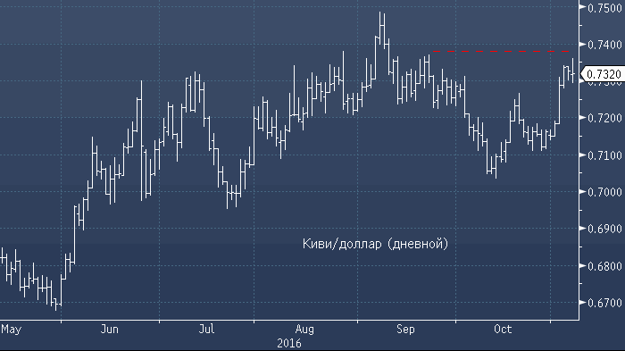 На прошлой неделе киви, как и большинство других валют, ощутимо подорожал против доллара на фоне сокращения зазора между рейтингами Хиллари Клинтон и Дональда Трампа. Кроме того, росту спроса на киви/доллар способствовала публикация хороших данных по рынку труда Новой Зеландии и неплохой статистики по Китаю. Несмотря на это, РБНЗ считает темпы роста экономики и инфляции в стране слишком низкими, что создает угрозу нового снижения ключевой ставки на 0.25% до 1.75%. В этих условиях, особенно если победит Хиллари Клинтон, пара в ближайшие недели может возобновить даунтренд, поэтому мы советуем продавать ее на росте выше $0.7380.