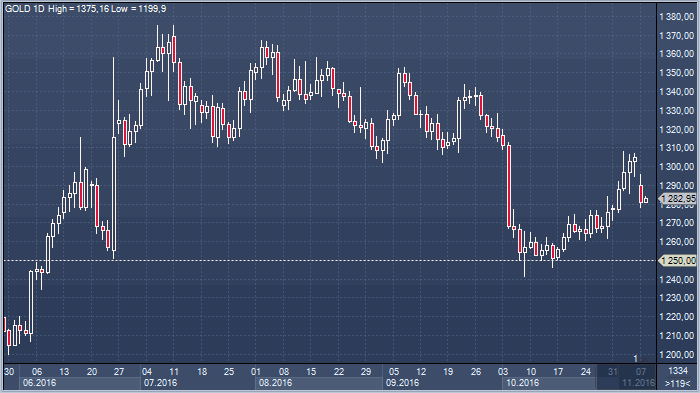 Цены на спот-рынке золота по итогам торгов в понедельник довольно сильно упали по сравнению с котировками закрытия торгов в пятницу. Финансовые рынки стали более уверены в победе Хиллари Клинтон на президентских выборах в США, что снизило спрос на безопасные активы и золото, в том числе. Goldman Sachs подтвердил свой 3-месячный и 6-месячный прогноз по ценам на золото на уровне 1280 долларов за унцию, ожидая, что в течение года стоимость этого драгоценного металла снизится до $1250 за унцию. Экономисты данного инвестиционного банка также делают ставку на победу госпожи Клинтон: «Демократам всего лишь потребуется выиграть в одном из крупных конкурентных штатов — Колорадо, Неваде или Северной Королине, где они предварительно лидируют и сохранить преимущество в других». Источник: ProFinance.Ru - Новости рынка Форекс