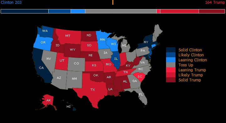 На представленной ниже карте США по состоянию на 06:00 мск на основании опросов отмечены штаты в семи цветовых градациях — от темно синего (уверенная победа Хиллари Клинтон) до темно красного (уверенная победа Дональда Трампа). Серым отмечены «сомневающиеся штаты». Источник: ProFinance.Ru - Новости рынка Форекс